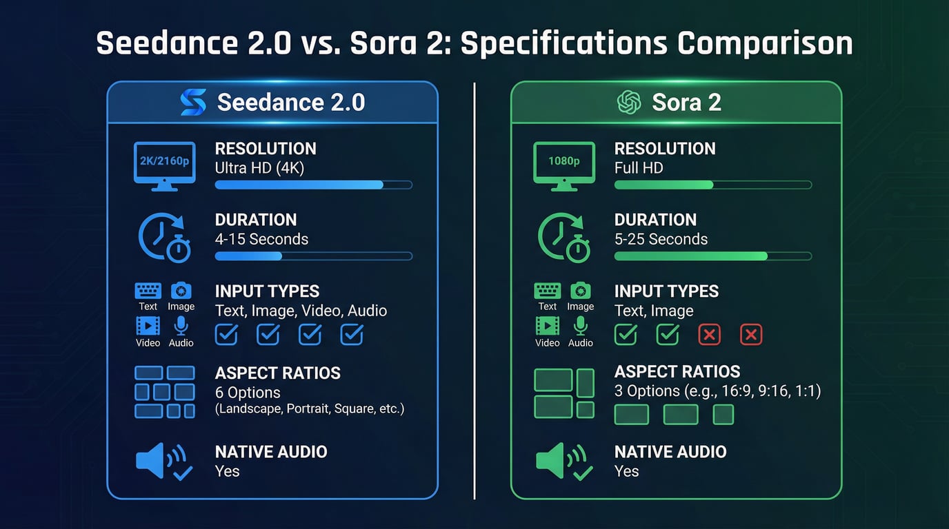 Una comparación exhaustiva entre Seedance 2.0 y Sora 2, analizando especificaciones técnicas, calidad de salida y casos de uso para ayudarte a elegir el generador de video con IA adecuado.