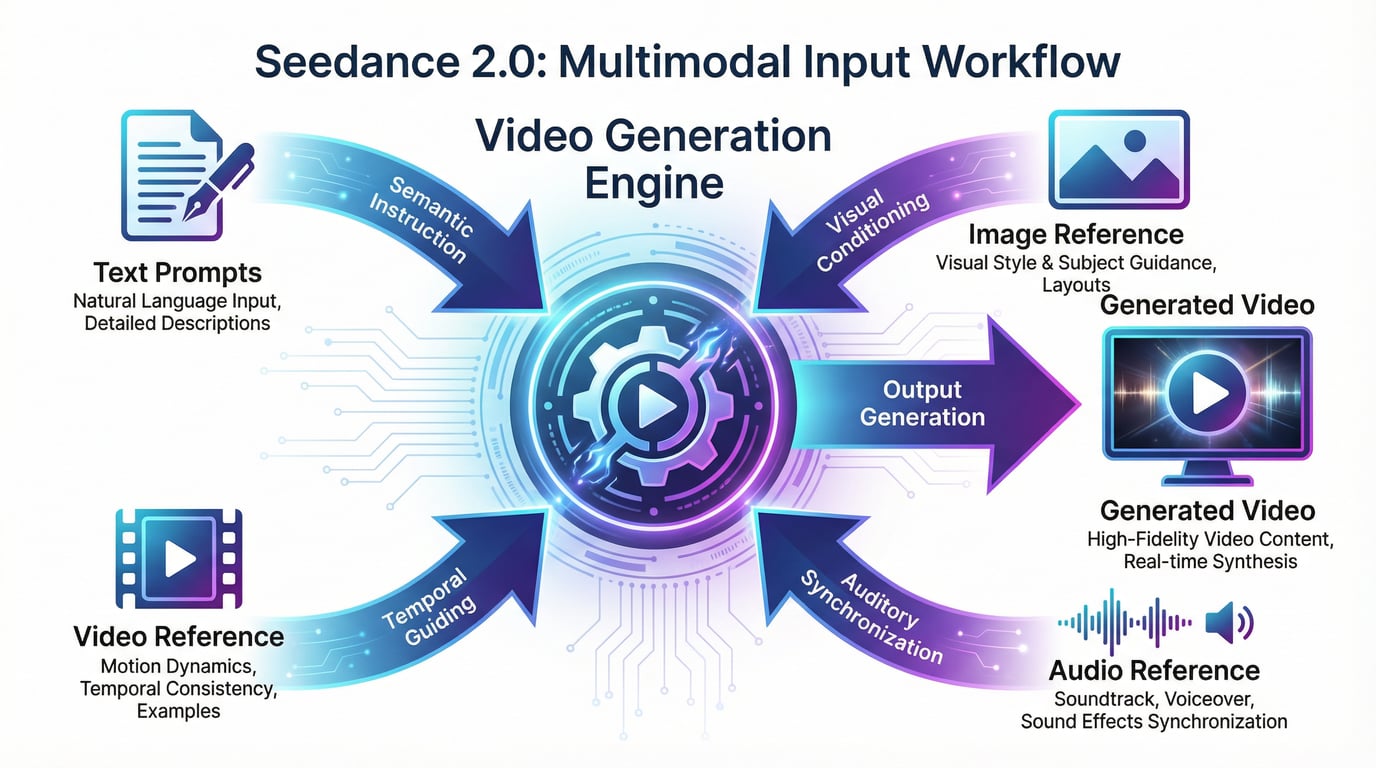 Seedance 2.0は、クリエイターがAI動画生成と対話する方法を根本的に変える統一マルチモーダルアーキテクチャを導入しています。主に書かれたプロンプトに依存する従来のテキストから動画へのモデルとは異なり、Seedance 2.0は4つの同時入力タイプを受け入れます:テキスト記述、参照画像、ビデオクリップ、オーディオトラックです。このクアッドモーダル参照システムにより、すべてを言葉で説明しようとするのではなく、モデルに例を示すことで、必要なものを正確に指定できます。