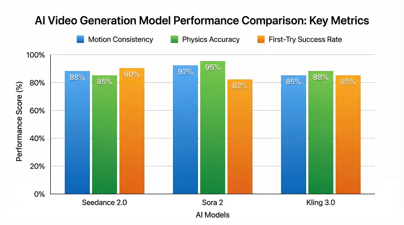 コミュニティテストでは、異なるパフォーマンスプロファイルが明らかになっています。Seedance 2.0は、優れた動きの一貫性とカメラのダイナミクスを示しており、オブジェクトとカメラの動きは自然で専門的に実行されているように感じられます。最初の試行での90%を超える成功率は、使用可能な結果を生成するために複数の生成試行を必要とした以前のツールを大幅に上回っています。